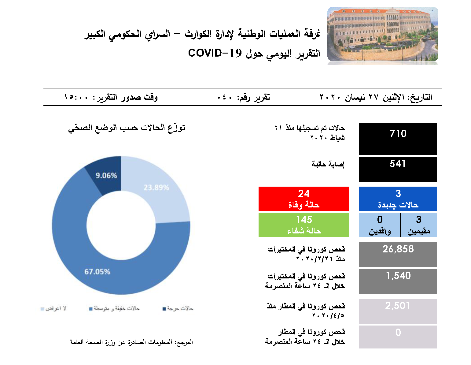 27 نيسان 2020 التقرير اليومي حول فيروس كورونا للتقرير الكامل باللغة العربية For report in English click Here