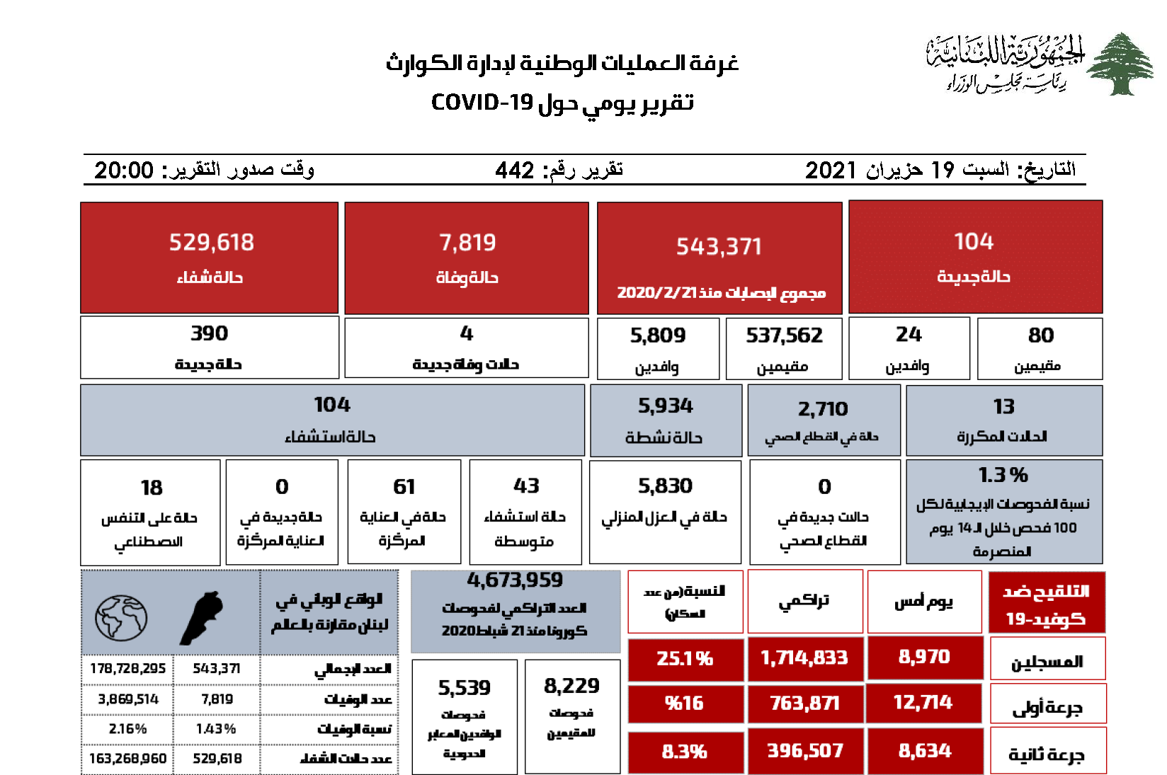 19 حزيران 2021 التقرير اليومي حول فيروس كورونا للتقرير الكامل باللغة العربية For report in English click Here