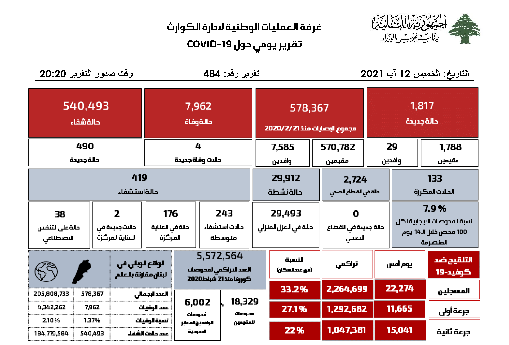12 آب 2021 التقرير اليومي حول فيروس كورونا للتقرير الكامل باللغة العربية For report in English click Here