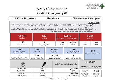 التقرير اليومي حول فيروس كورونا 02 تشرين الثاني 2020 للتقرير الكامل باللغة  المزيد... التقرير الاسبوعي لكارثة إنفجار مرفأ بيروت 02 تشرين الثاني 2020 المزيد... التقرير اليومي حول فيروس كورونا 01 تشرين الثاني 2020 للتقرير الكامل باللغة  المزيد... التقرير اليومي حول فيروس كورونا 31 تشرين الأول 2020 للتقرير الكامل باللغة  المزيد... التقرير اليومي حول فيروس كورونا 30 تشرين الأول 2020 للتقرير الكامل باللغة  المزيد... التقرير اليومي حول فيروس كورونا 29 تشرين الأول 2020 للتقرير الكامل باللغة  المزيد... التقرير اليومي حول فيروس كورونا 28 تشرين الأول 2020 للتقرير الكامل باللغة  المزيد... عرض النتائج 251-260 (من 497) |< < 22 - 23 - 24 - 25 - 26 - 27 - 28 - 29 - 30 - 31 > >|