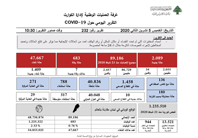 التقرير اليومي حول فيروس كورونا 03 تشرين الثاني 2020 للتقرير الكامل   المزيد... التقرير اليومي حول فيروس كورونا 02 تشرين الثاني 2020 للتقرير الكامل باللغة  المزيد... التقرير الاسبوعي لكارثة إنفجار مرفأ بيروت 02 تشرين الثاني 2020 المزيد... التقرير اليومي حول فيروس كورونا 01 تشرين الثاني 2020 للتقرير الكامل باللغة  المزيد... التقرير اليومي حول فيروس كورونا 31 تشرين الأول 2020 للتقرير الكامل باللغة  المزيد... التقرير اليومي حول فيروس كورونا 30 تشرين الأول 2020 للتقرير الكامل باللغة  المزيد... التقرير اليومي حول فيروس كورونا 29 تشرين الأول 2020 للتقرير الكامل باللغة  المزيد... التقرير اليومي حول فيروس كورونا 28 تشرين الأول 2020 للتقرير الكامل باللغة  المزيد... عرض النتائج 251-260 (من 497) |< < 22 - 23 - 24 - 25 - 26 - 27 - 28 - 29 - 30 - 31 > >|